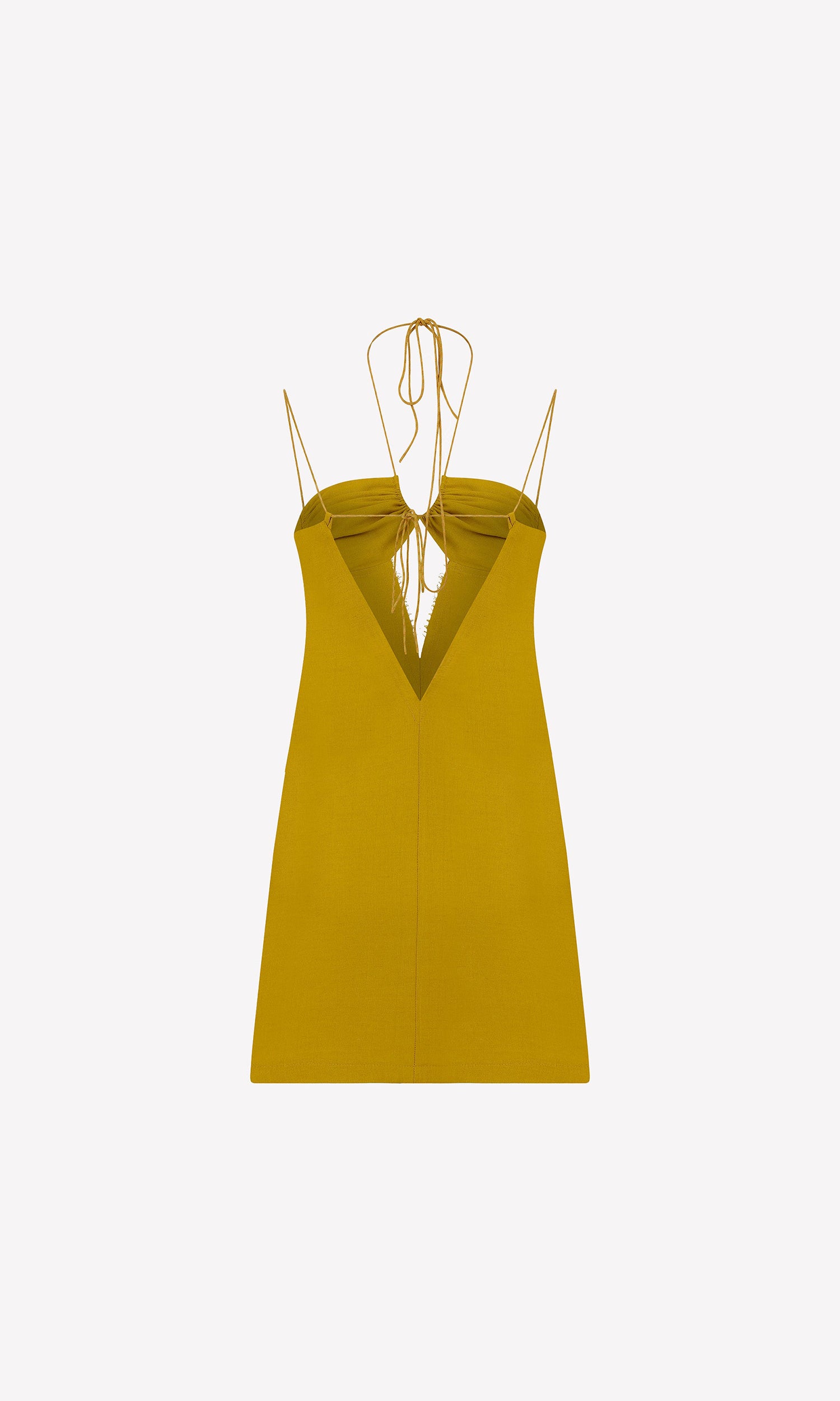 The striking diamond-shaped cutout is just one of the geometric details that make this summer dress so special. Double laces made of fine walking laces, finished with a rubber-covered knot, secure the low triangular back with raw edges and overlock stitching.