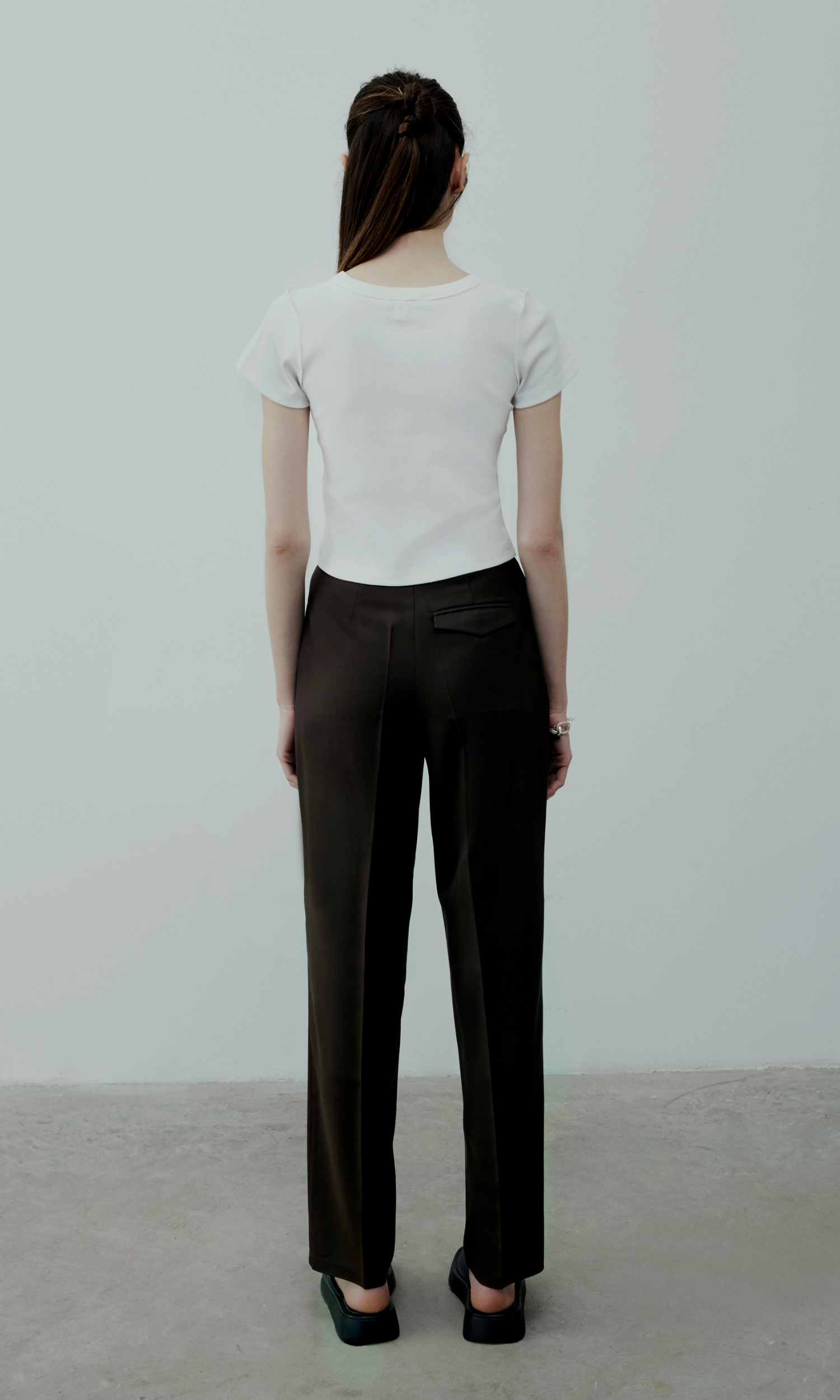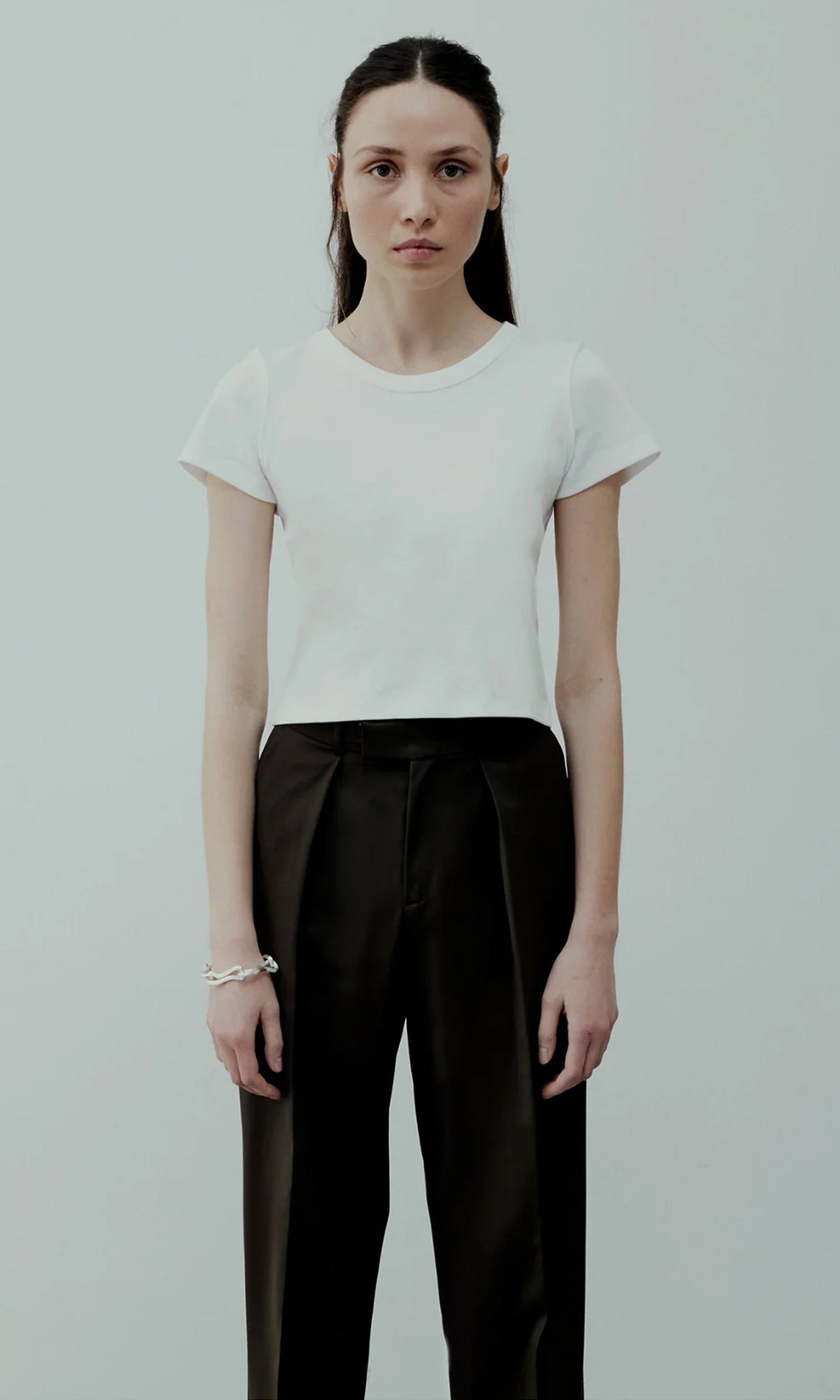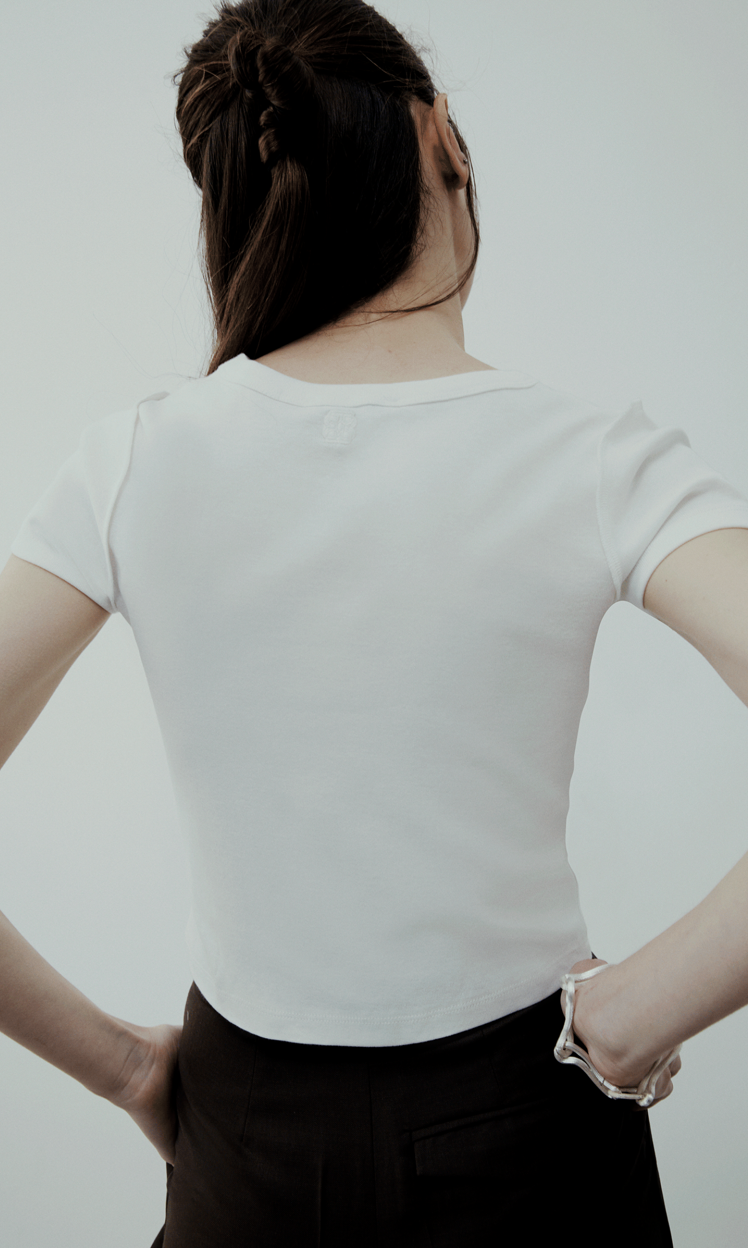 The cropped fit tee with serge thread detailing at shoulder seams.